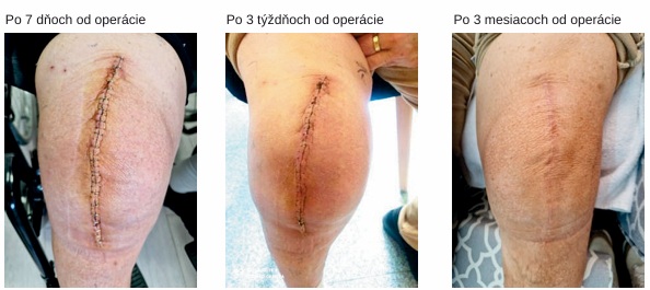 Rozália (78 r.) absolvovala totálnu endoprotézu (výmenu) kolenného kĺbu. Po operácii mala pozdĺž celého kolena jazvu, ako môžete vidieť na obrázku. Dcéra jej po zahojení jazvy začala pravidelne dvakrát denne aplikovať na postihnuté miesto silikónový gél Bliznasil. Jazva sa už po mesiaci používania menila. Po 3 mesiacoch používania Bliznasilu je jazva tenšia, hladšia a oveľa menej viditeľná. Účinky Bliznasilu máme naozaj overené, pani Rozália je s jeho účinkami nadmieru spokojná.